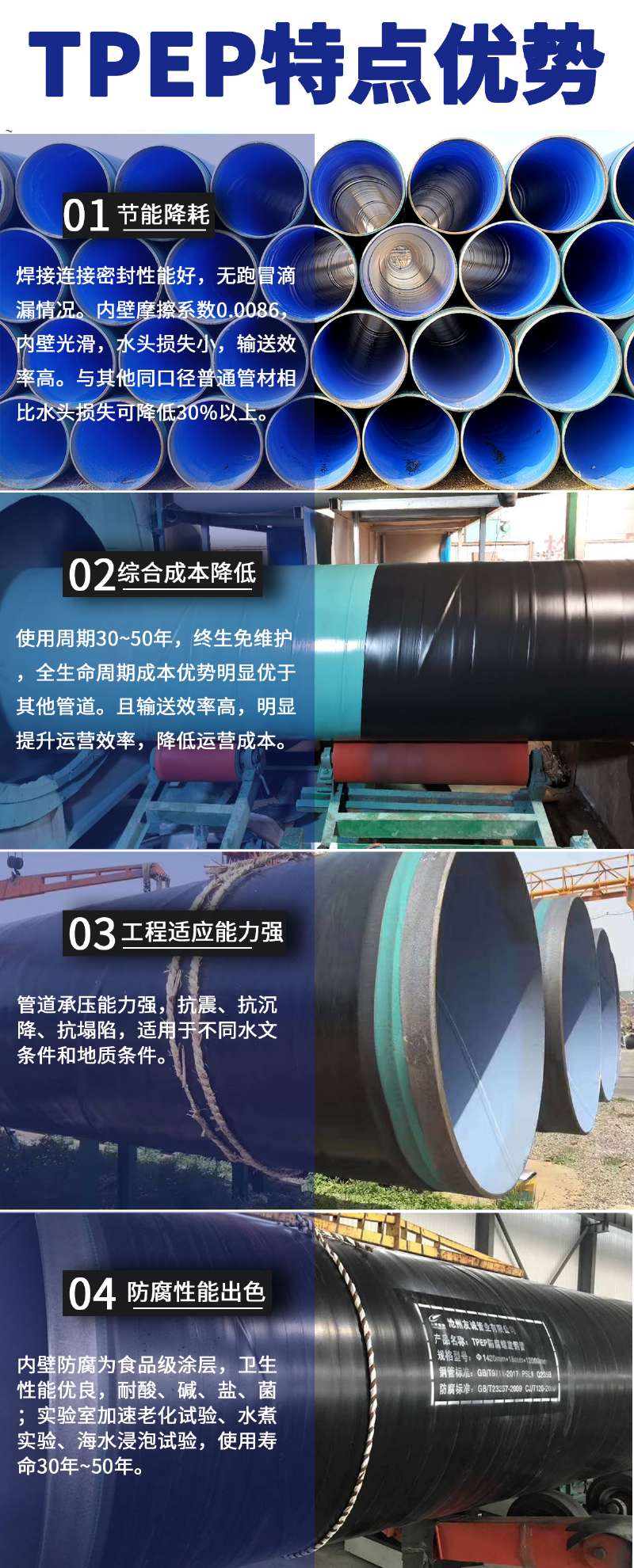 TPEP防腐鋼管工藝介紹:外壁采用熱熔結(jié)纏繞工藝底層環(huán)氧樹脂、中間層膠黏劑、外層聚乙烯形成三層結(jié)構(gòu)的防腐層,內(nèi)壁采用熱噴涂環(huán)氧粉末防腐方式,將粉末經(jīng)高溫加熱熔結(jié)后均勻地涂敷在管體表面上,形成鋼塑復(fù)合層,極大提高了涂層附著力及涂層厚度,增強(qiáng)了耐磕碰,耐腐蝕的能力。鋼管具有優(yōu)越的延展性