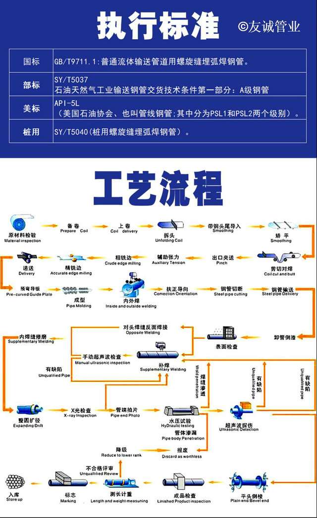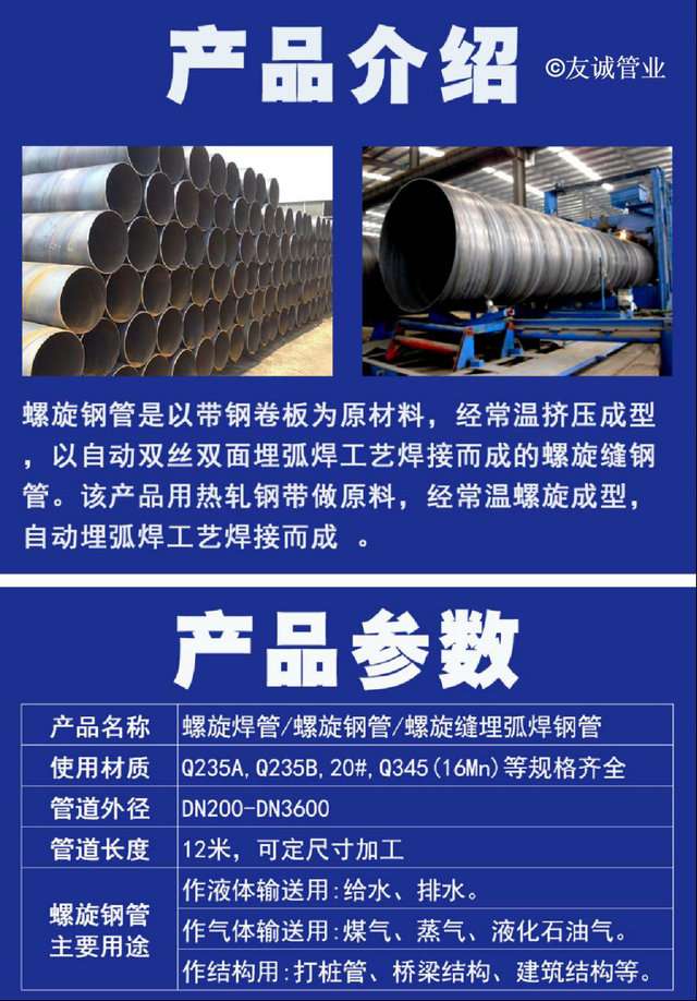 滄州友誠管業(yè)有限公司擁有多條國內(nèi)先進(jìn)的雙面埋弧焊螺旋鋼管生產(chǎn)線、大口徑直縫鋼管生產(chǎn)線。全部采用先進(jìn)的生產(chǎn)設(shè)備及美國林肯自動埋弧焊機(jī),并配備了在線數(shù)字超聲波探傷儀、靜水壓試驗機(jī)、X射線實時成像機(jī)等完備的質(zhì)檢儀器檢測。其主導(dǎo)產(chǎn)品是:Φ219mm至Φ2620mm,壁厚6mm-50mm的雙面埋弧焊螺旋鋼管:螺旋鋼管、排水專用螺旋鋼管、螺旋焊管主營材質(zhì):,Q235B、Q345、螺旋管也稱螺旋鋼管或螺旋焊管,是將低碳素結(jié)構(gòu)鋼或低合金結(jié)構(gòu)鋼鋼帶按一定的螺旋線的角度(叫成型角)卷成管坯,然后將管縫焊接起來制成,它可以用較窄的帶鋼生產(chǎn)大直徑的鋼管。