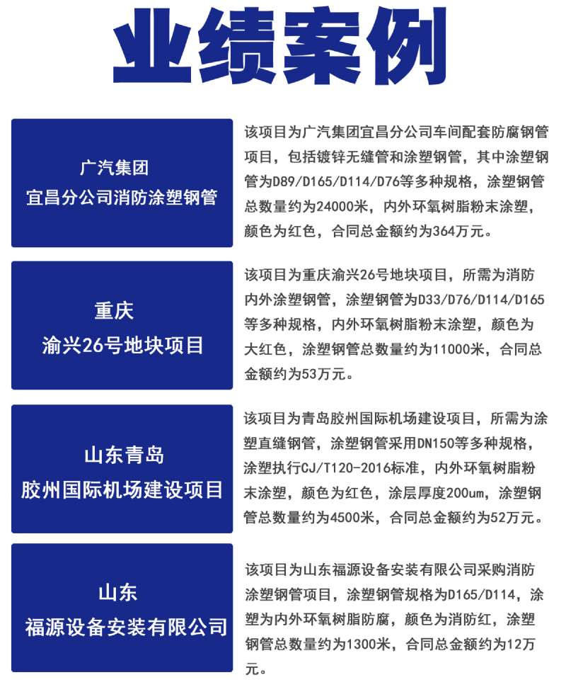 涂塑消防鋼管,以鋼管為基管,外壁涂裝高附著力,抗沖擊性,防腐耐候型的熱固性粉末涂料,內(nèi)壁涂裝高附著力,防腐,食品衛(wèi)生型的熱塑性粉末涂料,采用噴砂化學(xué)雙重前處理。涂塑鋼管具有優(yōu)良的耐腐蝕性和比較小的摩擦阻力,環(huán)氧樹脂涂塑鋼管適用于給排水,海水,溫水,油,氣體等介質(zhì)的輸送,聚氯乙烯涂塑鋼管適用于排水,海水,油,氣體等介質(zhì)的輸送,涂塑鋼管具有優(yōu)良的承壓性能和抗腐蝕性能。