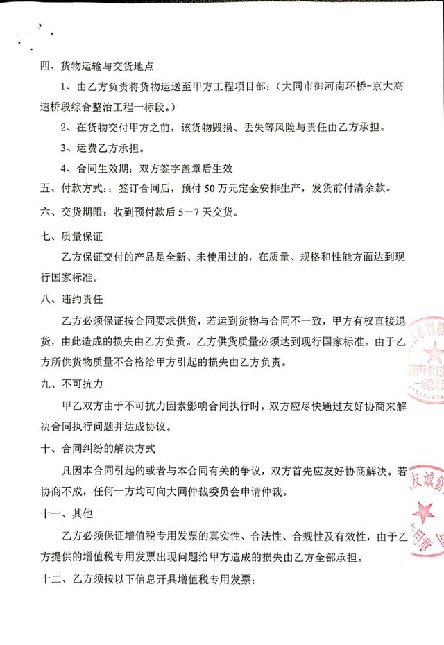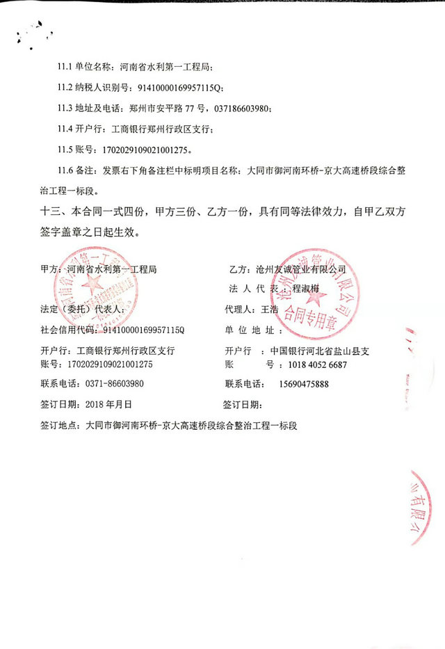 2018年我公司與河南省水利第一工程局合作,簽署大同市御河南環(huán)水利項(xiàng)目外PE內(nèi)EP防腐鋼管采購(gòu)合同,此工程管道尺寸為DN1200和DN600兩個(gè)規(guī)格,其鋼管防腐采用了最新型防腐形式-外PE內(nèi)EP防腐鋼管,防腐蝕強(qiáng)度高,作為地埋鋼管耐酸耐堿強(qiáng)度強(qiáng)度強(qiáng),能夠順利合作感謝客戶(hù)對(duì)我們的信任,采購(gòu)合同如下: